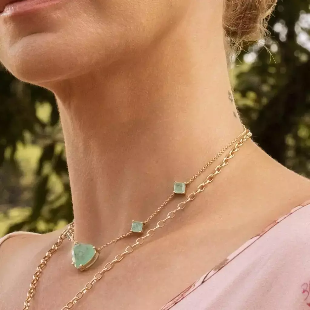 Colar com Pedra Fusion em formato de coração e pedras fusion em formato de quadrados dispersos com banho de ouro 18k.